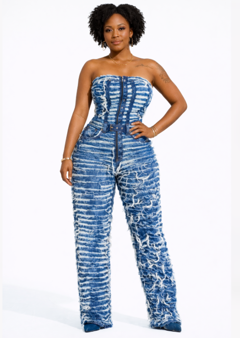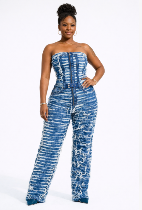 This jumpsuit blends confidence, comfort, and bold design—a true fashion essential for women who like their denim with personality.